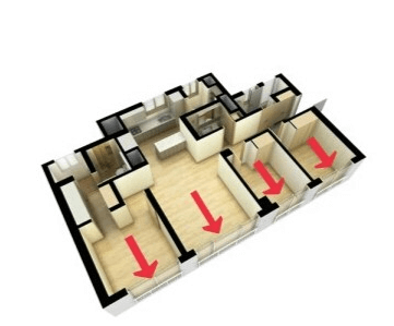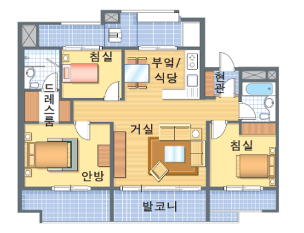 30평대 아파트의 형태는 대부분 안방, 거실, 안방 1, 안방 2를 가진 포베이 구조를 가지고 있습니다.