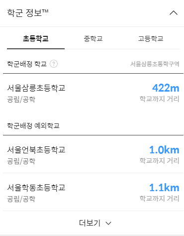 현재 위치를 조회한곳에서 학군에 대한 정보를 확인을 해볼수 있습니다. 몇미터까지 떨어져있는지 조회도 가능한데요.