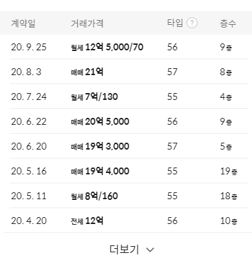 타입 정보라는 항목을 살펴보면 여기서 아파트시세의 변동을 확인을 할수 있습니다. 그리고 평당가의 시세를 확인을 해볼수 있는데요. 44평, 45평, 55평, 56평 등의 정보를 확인을 할수 있습니다.