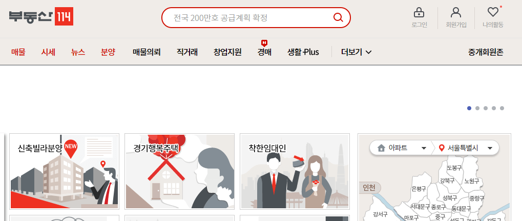 매물, 시세, 뉴스, 분양매물, 의뢰, 직거래, 창업, 지원, 경매, 생활 플러스, 신축 빌라, 분양, 경기행복주택, 착한임대인, 부동산 계산기, 부동산 상담, 분양 일정, 등 여러가지 서비스를 이용을 해 볼 수가 있습니다.