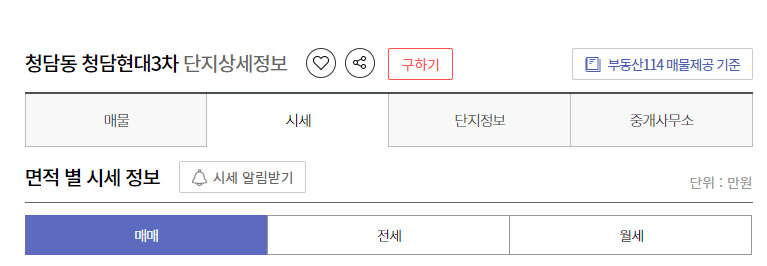 클릭을 하시면 청담동 청담 현대 3차 2단지에 대한 매매 전세 월세를 간단하게 확인을 하실 수가 있습니다.