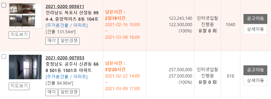 그리고 조회를 하고난후 아래와같이 부동산 경매물건을 확인을 할수 잇습니다. 인터넷입찰로 진행이 되는 경매물건이며, 조회수 및 유찰 횟수, 경매남은시간 등을 간단하게 확인이 가능합니다.