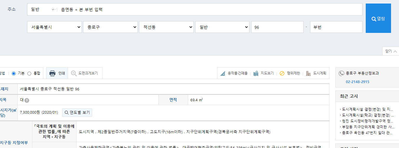 여기서 개별 공시지가 확인도 가능한데요. 저는 아래의 서울특벽시 종로구 쪽을 검색을 해보았습니다. 아래의 개별공시지가를 확인을 할수 있는데요.
