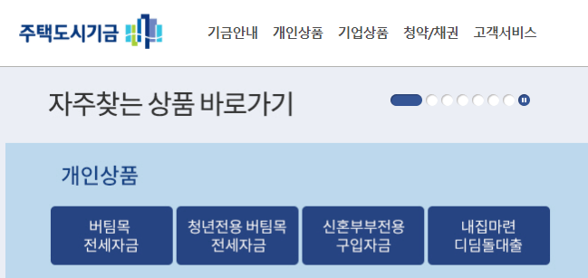 주택도시기금 홈페이지 입니다. 해당 홈페이지에서 내집을 구매를 할수 있는 내 집마련의 디딤돌과 전세자금 대출, 월세, 등의 대한 정보를 확인을 하고, 대출을 실행을 해주는 사이트입니다.