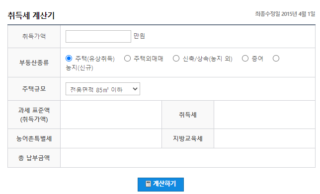 아파트 취득을 할수 있는 자동계산기도 있으니 참고하여 보시면 좋으실듯 합니다.