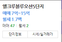 여기서 저는 엘크루 블루오션 5단지라는 매물에 대한 정보를 확인해 보도록 할 건데요. 아래 이미지와 보시는 거와 같이 시세/실거래가 항목을 클릭을 해 줍니다.