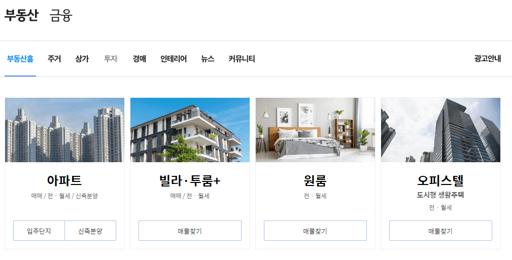 페이지를 이동을 하시면 아래와 같이 확인을 할수 있습니다. 주거, 상가, 투자, 경매, 인테리어, 뉴스 커뮤니티, 서비스등의 부동산 관련서비스를 다음과 같이 확인을 할수 있습니다.