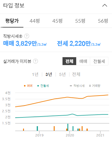 타입 정보라는 항목을 살펴보면 여기서 아파트시세의 변동을 확인을 할수 있습니다. 그리고 평당가의 시세를 확인을 해볼수 있는데요. 44평, 45평, 55평, 56평 등의 정보를 확인을 할수 있습니다.